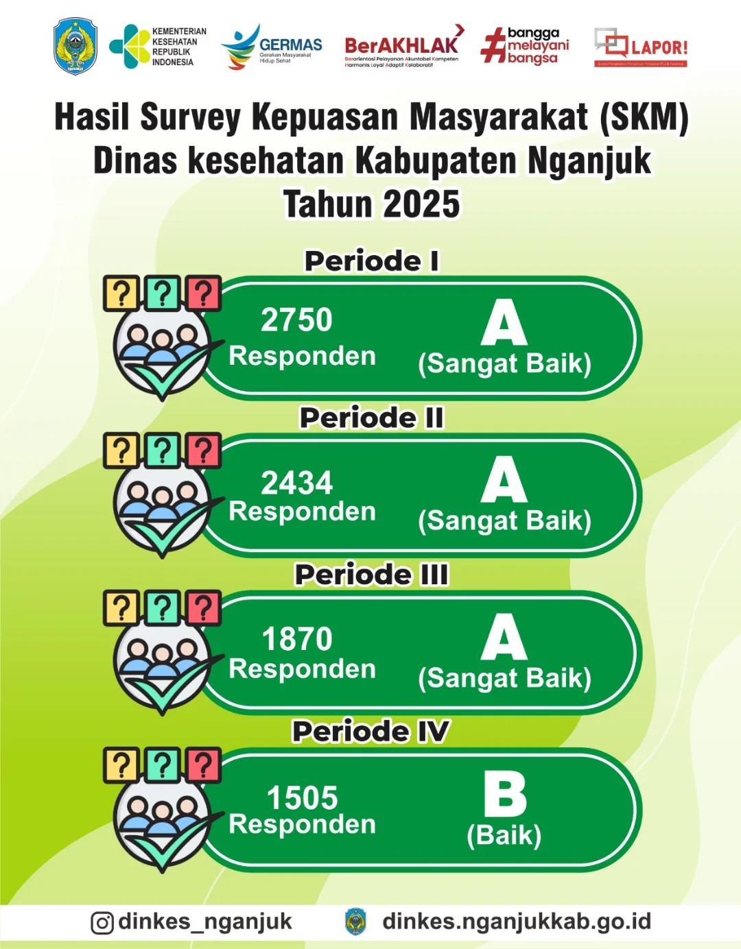 Dinas Kesehatan Kabupaten Nganjuk berkomitmen terus meningkatkan kualitas pelayanan kesehatan. Melalui Survei Kepuasan Masyarakat Tahun 2025, kami menghimpun suara masyarakat sebagai dasar evaluasi dan perbaikan berkelanjutan demi layanan yang semakin prima. Terima kasih atas partisipasi masyarakat dalam Survei Kepuasan Masyarakat Tahun 2025. Masukan Anda menjadi pendorong kami dalam mewujudkan pelayanan kesehatan yang lebih baik.
